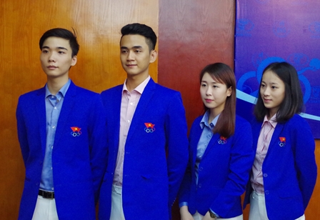 Bộ trang phục gồm áo Veston chất liệu visco được thiết kế lịch sự, khỏe mạnh, gọn gàng trên nền sắc xanh của tuổi trẻ kết hợp với quần âu màu trắng thể hiện sự mạnh mẽ, tự tin và đầy sức sống, trên ngực trái áo veston là biểu tượng của Ủy ban Olympic Việt Nam thêu sắc nét.