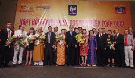 Chủ tịch UBTƯMTTQ Việt Nam Nguyễn Thiện Nhân, Nguyên Phó Chủ tịch nước Trương Mỹ Hoa, Lãnh đạo Hiệp hội doanh nghiệp nhỏ và vừa Việt Nam T.S Nguyễn Văn Thân- Luật gia Tô Hoài Nam, Tổng Biên tập Tạp chí doanh nghiệp và Hội nhập - Báo điện tử doanh nghiệp Việt Nam Vũ Quang Trạch tặng hoa và chụp hình lưu niệm cùng các Doanh nhân tại “Ngày hội Doanh nhân, doanh nghiệp toàn quốc năm 2015”