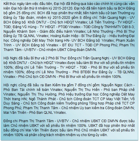 Bí thư Đảng ủy Khối Doanh nghiệp Trung ương Bùi Văn Cường cũng cho rằng, với những thành tựu đã đạt được trong nhiệm kỳ 2010 - 2015, Đảng bộ Vinatex đã khẳng định được vai trò hạt nhân trong lãnh đạo Tập đoàn, giữ vững vai trò dẫn dắt, định hướng ngành dệt may, góp phần quan trọng đưa Việt Nam trở thành một trong 10 quốc gia lớn về dệt may, khẳng định được vai trò chủ đạo của doanh nghiệp nhà nước trong ngành dệt may. Bên cạnh những kết quả đạt được, Đảng bộ Tập đoàn còn bộc lộ một số mặt hạn chế, nhưng BCH Đảng bộ Vinatex đã nghiêm túc túc kiểm điểm những tồn tại và tìm ra các giải pháp khắc phục trong nhiệm kỳ tới để tạo ra những bước đột phá của Tập đoàn và ngành Dệt May Việt Nam nhằm thích ứng với giai đoạn hội nhập và phát huy tối đa cơ hội của những Hiệp định thương mại đa phương.